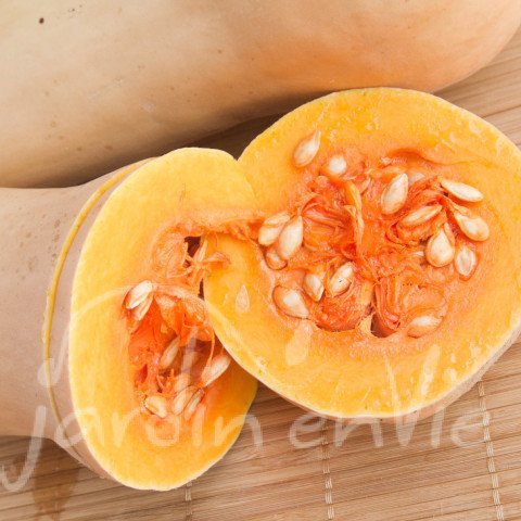 (Cucurbita moschata). Tardive, coureuse, chaque pied produit 4 à 7 fruits de 1 à 2kg allongés et renflés au bout, beige rosé contenant très peu de graines. Chair jaune à orange, fine, beurrée et fondante comme un avocat, au goût musqué. (env. 10Grn/g)